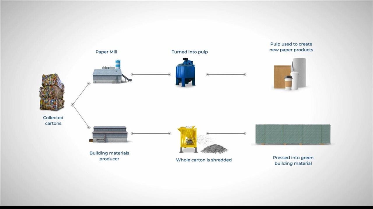 After they're collected and sorted, cartons can go on to have a second life as tissues, paper towels and writing paper or as high-performance building materials, such as roofing cover board. But how does this happen? Read on to discover what happens to recycled cartons after you've put the bin out on the curb.
